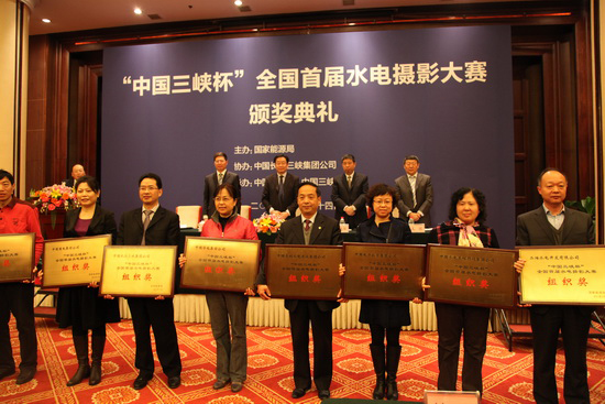 2011年11月14日,“中國三峽杯”全國首屆水電攝影大賽頒獎典禮在北京召開,劉琦副局長出席并頒獎,新能源和可再生能源司、政策法規司有關同志參加。圖為主辦單位領導和嘉賓向獲獎單位頒獎。
