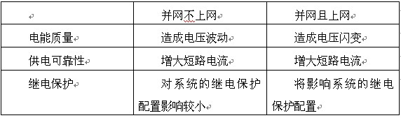 圖1 分布式能源的立項管理示意圖 (2)項目投資方向政府有關部門提交立項申請,取得同意后開展前期工作。 (3)項目投資方開展項目可研工作,并通過消防部門、環保部門關于消防安全、環境影響的審查。此外,對于并網的項目,需要由電網企業確認;對于需要享受優惠政策的項目需要向政府有關部門指定的機構提交項目設計文件,由該機構對項目的能效水平、環境影響情況進行評估,并出具評估報告。 (4)項目業主在上述審查意見基礎上編制項目申請報告,遞交政府有關部門進行審批。政府有關部門根據上述相關材料,決定是否核準項目實施,并下達立項批復。 二、并網管理 分布式能源系統是集中式能源系統的有益補充,共同構成相互支持的現代能源供應體系。除偏遠地區為了解決基本用電需求的獨立供電系統外,分布式能源系統通過與大電網的并網運行,由公用電網為其提供備用,可以提高分布式能源業主的供電可靠性,同時還將可能提高分布式能源系統運行的經濟性。對于電網企業來講,在分布式能源的發展過程中,需要通過分布式能源的發展,需要保證電網的安全運行,分布式能源的發展不影響向其他用戶的安全可靠供電。 (一)不同并網方式對配電網的影響 “并網運行”是指分布式能源系統在正常運行狀態下,與公用電網在主回路上存在電氣連接1。電氣連接包括電纜直接連接、經變壓器連接、經逆變器連接等方式。為了保證分布式能源的經濟和穩定運行,分布式能源需要采用與公共電網并網運行的方式。分布式能源系統并網運行按照功率交換方式可分為“并網不上網”和“并網且上網”兩種。“并網不上網”方式下,則分布式能源只與公共電網并網運行,電流的方向只能是從公用電網流向分布式能源系統用戶;“并網且上網”方式下,分布式能源系統不僅可以與公共電網并網運行,同時還可以向公用電網輸送多余電量。不同并網方式對配電網的影響對比如表5-1所示。 表1 不同的并網方式對配電網的影響對比