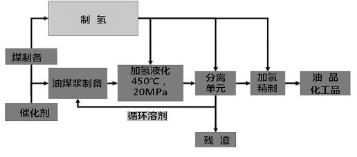 煤炭直接液化是指在高溫、高壓條件下,在催化劑和溶劑作用下使煤中大分子進行裂解加氫,直接轉化成液體,再進一步加工精制成汽油、柴油等燃料油。 煤炭直接液化的工藝過程主要包括:煤的破碎與干燥、煤漿制備、加氫液化、固液分離、氣體凈化、液體產品分餾和精制,以及煤氣化制取氫氣等部分。典型直接液化工藝過程如下圖所示。