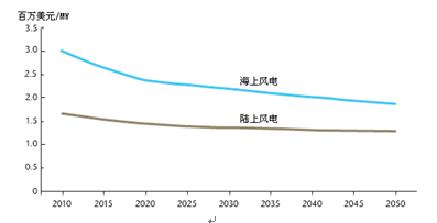圖1 到2050年全球各地區(qū)風(fēng)力發(fā)電量總和 來源:IEA. 2009. Technology Roadmaps - Wind energy. http://www.iea.org/papers/2009/Wind_Roadmap.pdf. ????路線圖預(yù)測,陸上風(fēng)能投資的成本將從2010年的170萬美元/MW,降至2030年的140萬美元/MW,2050年的130萬美元/MW,總成本降幅為23%;運(yùn)維成本到2030年將降低17%,到2050年降低23%。海上風(fēng)能,特別是深海風(fēng)能,成本削減有可能更快,其投資成本到2030年會(huì)降低27%,到2050年會(huì)降低38%;運(yùn)維成本到2030年將降低25%,到2050年降低35%(圖2)。