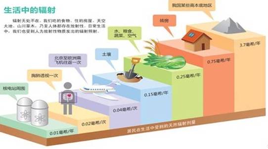 ????人類無時無刻不在接受著各種天然射線的照射,如宇宙射線,存在于土壤、巖石、水和大氣中的鈾-238,鈾-235,釷-232,鉀-40,鐳-226等,這些天然射線的照射就是天然本底輻射。 ????輻射存在于整個宇宙空間,人類有史以來一直受著天然電離輻射源的照射,包括宇宙射線、地球放射性核素產生的輻射等。人工輻射是指與核相關的人為活動引起的對公眾的照射,主要是醫療照射,一次胸部透視可以達到0.02毫希。 ????聯合國原子輻射影響科學委員會2010年發布報告稱,在所有人為因素導致的輻射中,醫療輻射所占的比例高達98%。核電站產生的輻射劑量非常小,約0.25%。 ????度量輻射劑量的單位是希沃特(Sv),簡稱希。希沃特是個很大的單位,通常使用的是微希和毫希。1000微希(μSv)等于1毫希(mSv),1000(mSv)毫希等于1希(Sv)。 |