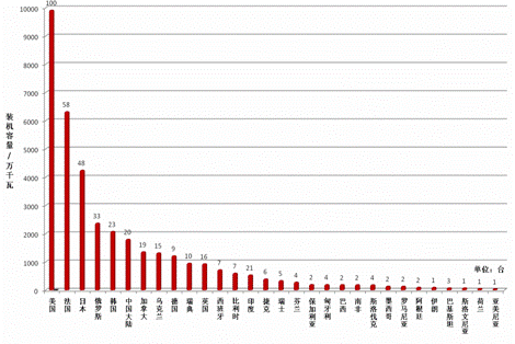 30.世界核電的發展現狀如何???? 截至2014年6月30日,全球在運核電機組435臺,總裝機容量3.73億千瓦;在建機組72臺,總裝機容量6837萬千瓦。在建、在役機組按堆型分布見圖1和圖2。在役反應堆中,壓水堆、沸水堆和重水堆是三種主要堆型,分別占總數的63.0%、18.6%和11.0%。在建反應堆大部分為壓水堆,占到83.3%。全球已具有核發電能力的國家中,美國、法國、日本、俄羅斯和韓國的在運反應堆數量為世界前五位,共占全球總數的60.2%。中國2014年運行核電機組22臺,列第六位。全球在役、在建核電機組裝機容量與臺數按國家統計情況見圖3和圖4。 ??? 國際原子能機構(IAEA)對世界核電站廠址按濱海、濱河、濱湖劃分為三大類。我們按照習慣,將國際上稱為濱河和濱湖廠址的核電站通稱為內陸核電站。截至2013年底全球在運442臺核電機組中,內陸核電機組總共有220臺。世界上內陸核電站占投運核電機組總數的50%,其中美國為63%、法國69%、加拿大86%、德國82%、俄羅斯58%、烏克蘭100%。