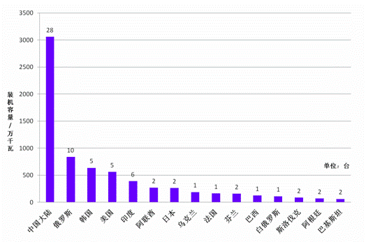 圖4各國在建核電機組裝機容量與臺數 注:圖中未包括中國臺灣地區2臺,總裝機容量260萬千瓦