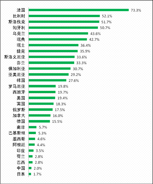 ??? 根據IAEA統計數據,2013年全球核能發電量總計23589億千瓦時,比2012年增加129億千瓦時。2013年核電國家中核能發電比例占10%以上的有20個,包括美、法等發達國家,其中法國核電比例最高,為73.3%,美國為19.4%,俄羅斯為17.5%,英國為18.3%,韓國為27.6%(圖5)。