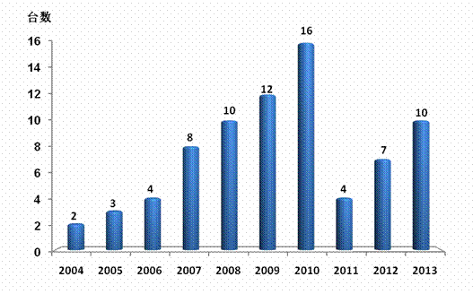 圖5? 2013年主要核電國家核能發電比例 注:數據來自IAEA ??? 自日本福島核事故發生以來,各國不斷采取措施,對現有反應堆開展安全檢查與評估,組織經驗反饋與交流,不斷改進優化核電技術,進一步提升了核電安全性。當前全球核電建設已經開始復蘇,在福島核事故后全球已經有22臺核電機組相繼開工(含2014年阿根廷1臺小型堆)。圖6為2004—2013年全球每年新開工核電機組變化情況。