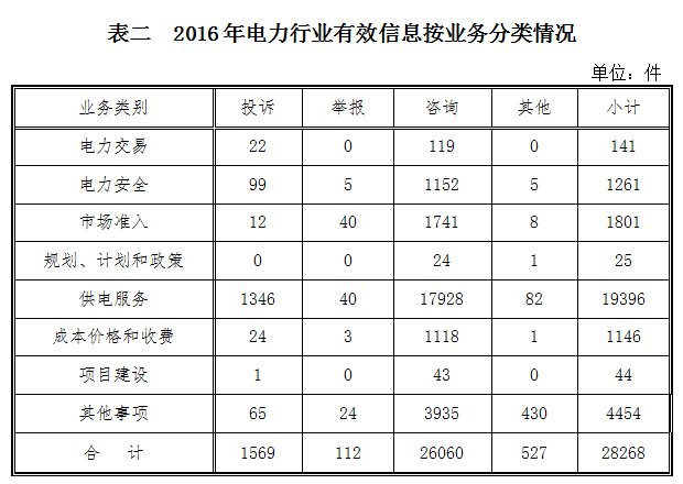 ????(二)分類情況 ????2016年,12398熱線收到的有效信息中,電力行業(yè)類28271件,占86.07%;新能源和可再生能源行業(yè)類903件,占2.75%;石油天然氣行業(yè)類741件,占2.26%;煤炭行業(yè)類11件,占0.03%;其他事項(xiàng)2919件,占8.89%。 ????投訴舉報(bào)主要集中在電力行業(yè),共1681件。從業(yè)務(wù)分類情況看,供電服務(wù)方面1386件,占82.45%;電力安全方面104件,占6.19%;市場準(zhǔn)入方面52件,占3.09%;成本價(jià)格和收費(fèi)27件,占1.61%;電力交易方面22件,占1.31%;項(xiàng)目建設(shè)方面1件,占0.06%;其他事項(xiàng)89件,占5.29%。(2016年電力行業(yè)有效信息按業(yè)務(wù)分類情況見表二)