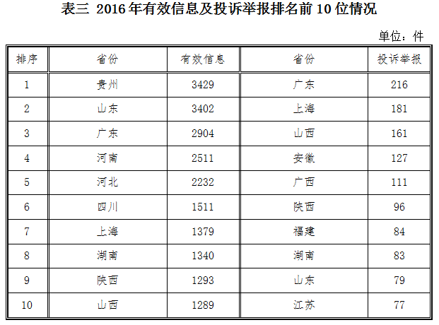 ????(三)區(qū)域分布情況 ????各省(自治區(qū)、直轄市)按照收到的有效信息數(shù)量排序,貴州省、山東省、廣東省、河南省、河北省列全國前5位;按照投訴舉報(bào)數(shù)量排序,廣東省、上海市、山西省、安徽省、廣西自治區(qū)排在全國前5位。(2016年有效信息及投訴舉報(bào)排名前10位情況見表三)