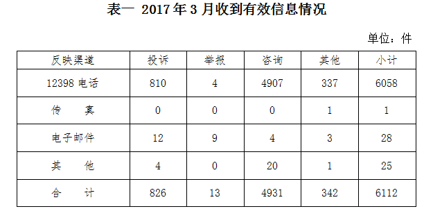 ????為了保護能源投資者、經營者、使用者的合法權益,維護能源市場秩序,依法履行監管職責,國家能源局積極暢通投訴舉報渠道,切實發揮12398(含12398電話、傳真、電子郵件等)能源監管投訴舉報熱線的作用,認真受理能源監管投訴舉報事項,定期公布投訴舉報處理情況。現將2017年3月份12398能源監管投訴舉報處理情況通報如下: ????一、基本情況 ????(一)收到有效信息情況 ????2017年3月,國家能源局12398能源監管熱線(以下簡稱12398熱線)共收到有效信息6112件,環比增加50.06%,同比增加106.77%。 ????按訴求性質分類,投訴826件,占有效信息的13.51%;舉報13件,占有效信息的0.21%;咨詢4931件,占有效信息的80.68%;表揚、求助、建議等其他方面342件,占有效信息的5.60%。 ????按反映渠道分類,12398電話6058件,傳真1件,電子郵件28件,其他25件。(2017年3月收到有效信息情況見表一)
