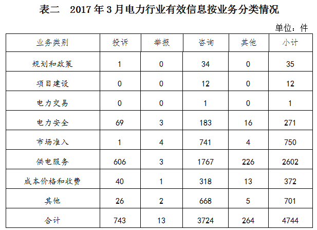 ????(二)分類情況 ????2017年3月收到的有效信息中,電力行業類4744件,占77.62%;新能源和可再生能源行業類592件,占9.69%;石油天然氣行業類80件,占1.31%;煤炭行業類6件,占0.10%;其他事項690件,占11.28%。 ????投訴舉報主要集中在電力行業,共756件。從業務分類情況看,規劃和政策方面1件,占0.13%;電力安全方面72件,占9.53%;市場準入方面5件,占0.66%;供電服務方面609件,占80.56%;成本價格和收費方面41件,占5.42%;其他方面28件,占3.70%。(2017年3月電力行業有效信息按業務分類情況見表二)。