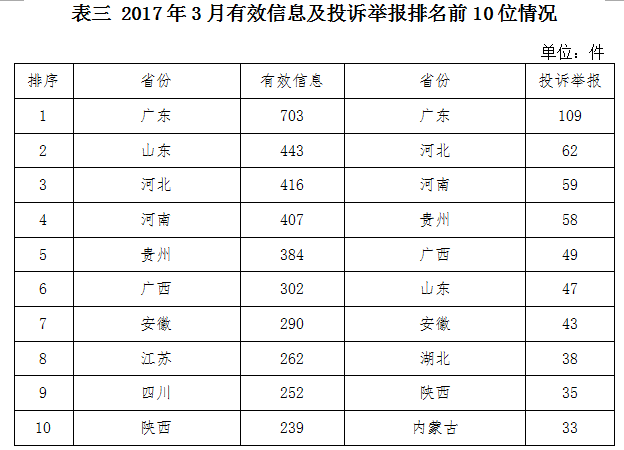 ????(三)區域分布情況 ????各省(自治區、直轄市)按照收到的有效信息數量排序,廣東、山東、河北、河南、貴州、廣西、安徽、江蘇、四川、陜西列全國前10位;按照投訴舉報數量排序,廣東、河北、河南、貴州、廣西、山東、安徽、湖北、陜西、內蒙古排在全國前10位。(2017年3月有效信息及投訴舉報排名前10位情況見表三)