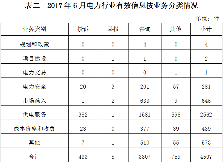 ????(二)分類情況 ????2017年6月收到的有效信息中,電力行業類4507件,占78.4%;新能源和可再生能源行業類567件,占9.86%;石油天然氣行業類32件,占0.56%;其他事項643件,占11.18%。 ????投訴舉報主要集中在電力行業,共441件。從業務分類情況看,項目建設方面1件,占0.23%;電力安全方面23件,占5.22%;市場準入方面3件,占0.68%;供電服務方面383件,占86.85%;成本價格和收費方面23件,占5.22%;其他方面8件,占1.81%。(2017年6月電力行業有效信息按業務分類情況見表二)。