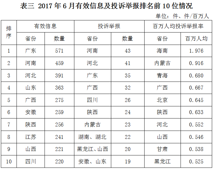 ????(三)區域分布情況 ????各省(自治區、直轄市)按照收到的有效信息數量排序,廣東、河南、河北等省列全國前10位;按照投訴舉報數量排序,河南、河北、廣東等省排在全國前10位;按照百萬人均投訴舉報率排序,海南、內蒙古、青海等省位于全國前10位。(2017年6月有效信息及投訴舉報排名前10位情況見表三)