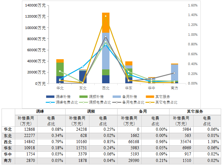 ????從分項電力輔助服務(wù)補償費用來看,調(diào)峰、AGC和備用補償費用占電力輔助服務(wù)補償總費用的絕大部分比例,但各區(qū)域的補償費用結(jié)構(gòu)也有自身明顯特征。其中,調(diào)峰補償力度以西北、東北最高,AGC補償力度以西北、華北最高,備用補償力度以西北、南方最高。總體來看,西北區(qū)域的輔助服務(wù)補償力度最大(見圖3)。