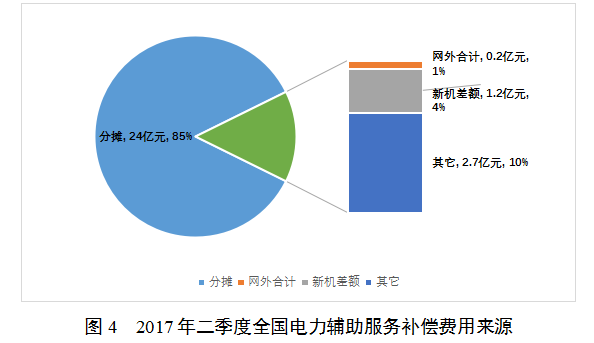 ????圖3 2017年二季度各區(qū)域各項電力輔助服務(wù)補償費用情況 ????注:西北區(qū)域調(diào)頻為AGC加一次調(diào)頻,其他區(qū)域調(diào)頻為AGC。 ????從電力輔助服務(wù)補償費用來源來看,主要來自分?jǐn)傎M用,合計24億元,跨省區(qū)輔助服務(wù)補償分?jǐn)偘l(fā)生費用合計0.2億元,新機差額資金合計1.2億元,考核等其他費用合計2.7億元,無分?jǐn)倻p免費用(見圖4)。