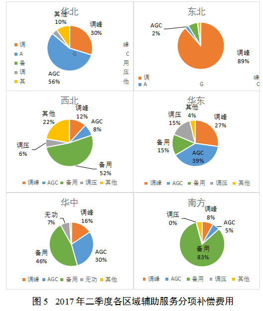 ??????二、2017年二季度各區(qū)域電力輔助服務(wù)規(guī)則執(zhí)行情況 ????自2006年原國家電監(jiān)會頒布《并網(wǎng)發(fā)電廠輔助服務(wù)管理暫行辦法》、《發(fā)電廠并網(wǎng)運行管理規(guī)定》以來,六家區(qū)域派出能源監(jiān)管機構(gòu)分別結(jié)合本區(qū)域內(nèi)電源、負(fù)荷和電網(wǎng)結(jié)構(gòu)等實際情況,制定了相應(yīng)的“兩個細(xì)則”,形成了各具特色的補償機制,并結(jié)合電力市場實際情況不斷修訂完善。其中,東北區(qū)域為解決制約可再生能源消納的調(diào)峰問題,開展了東北區(qū)域電力輔助服務(wù)市場專項改革試點工作;華北區(qū)域加大調(diào)峰補償力度,建立了調(diào)峰補償新機制;華北、華東和南方區(qū)域增設(shè)了自動電壓控制服務(wù)(以下簡稱AVC)補償;西北區(qū)域除AGC補償外,對一次調(diào)頻也予以補償。 ????(一)各區(qū)域電力輔助服務(wù)補償費用情況 ????各區(qū)域輔助服務(wù)分項補償費用如圖所示,各項費用比例構(gòu)成各有特色。其中,調(diào)峰是“三北”地區(qū)的共同需求,以應(yīng)對供暖和可再生能源消納的雙重壓力,在華北、東北和西北區(qū)域的輔助服務(wù)補償費用中占據(jù)相當(dāng)大的比例(見圖5)。 ????華北區(qū)域由于發(fā)電自動化控制水平較高,電力輔助服務(wù)補償費用占比最多的為AGC補償,其次為調(diào)峰和AVC補償,體現(xiàn)了保障首都供電安全對電能質(zhì)量的高標(biāo)準(zhǔn)需求。 ????東北區(qū)域由于供熱機組比例大、供熱期長、風(fēng)電裝機占比高,電力輔助服務(wù)補償費用主要為調(diào)峰補償費用。 ????西北區(qū)域由于裝機容量增長較快,區(qū)內(nèi)負(fù)荷有限,外送需求不足,同時區(qū)域內(nèi)能源類型比較豐富,使得各種輔助服務(wù)均占有一定比例,調(diào)峰、AGC和備用補償費用比例基本持平,體現(xiàn)出一種多能互補的態(tài)勢。 ????華東區(qū)域由于江浙滬地區(qū)以火電為主的電源結(jié)構(gòu)在消納區(qū)外來電和可再生能源時面臨的調(diào)峰壓力,本地備用容量也存在部分富余,電力輔助服務(wù)補償費用以調(diào)峰、AGC補償為主,但備用補償占比也較為明顯。 ????華中和南方區(qū)域由于兩區(qū)域內(nèi)水電裝機容量占比較高,備用補償費用在本區(qū)域各項費用中為最高。