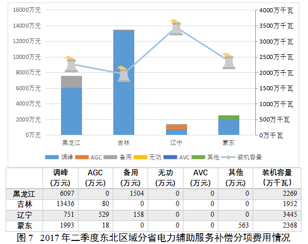 ???(四)東北區(qū)域電力輔助服務(wù)補償情況 ????東北區(qū)域受供暖和可再生能源消納壓力,主要輔助服務(wù)補償費用為調(diào)峰補償,而AGC補償主要則發(fā)生在工業(yè)負(fù)荷相對集中的遼寧省(見圖7)。