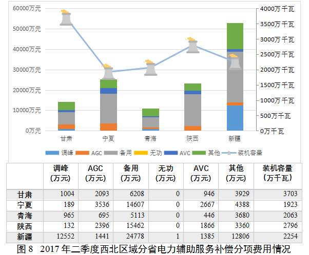 ???????(五)西北區(qū)域電力輔助服務(wù)補償情況 ????西北區(qū)域各省總費用差異較大。由于新疆、甘肅的可再生能源發(fā)電裝機容量明顯高于其他省份,兩地的調(diào)峰補償力度較大;青海省由于集中了黃河流域的大型水電,承擔(dān)了為整個區(qū)域調(diào)節(jié)的任務(wù),但由于僅在省內(nèi)發(fā)電企業(yè)間分?jǐn)傎M用,未實現(xiàn)區(qū)域總體補償,造成單位裝機容量輔助服務(wù)補償費用相對較高(見圖8)。