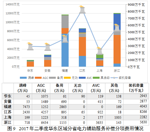 ????(六)華東區(qū)域電力輔助服務(wù)補償情況 ????華東區(qū)域外來電落點較為集中,電源類型比較豐富,各省市之間體現(xiàn)出明顯的差異和互補性。福建以調(diào)峰費用為主,而浙江則以AGC補償為主。浙江和福建的輔助服務(wù)補償標(biāo)準(zhǔn)較高;江蘇省由于本地平衡情況較好,輔助服務(wù)補償力度相對較小。與其他區(qū)域不同,除了五省市外,華東區(qū)域還單獨對網(wǎng)調(diào)機組進行輔助服務(wù)補償和考核(見圖9)。