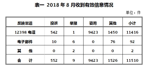 2018年8月12398能源監管熱線投訴舉報處理情況通報