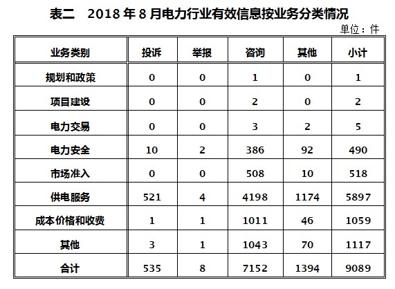 ????二、分類情況 ????2018年8月收到的有效信息中,電力行業類9089件,占78.97%;新能源和可再生能源行業類1192件,占10.36%;石油天然氣行業類226件,占1.96%;煤炭行業類6件,占0.05%;其他事項997件,占8.66%。 ????收到的投訴舉報中,電力行業類543件,占96.79%。新能源和可再生能源行業類共18件,占3.21%。電力行業的投訴舉報中,電力安全方面12件,占2.21%;供電服務方面525件,占96.68%;成本價格和收費方面2件,占0.37%;其他方面4件,占0.74%。(2018年8月電力行業有效信息按業務分類情況見表二)。