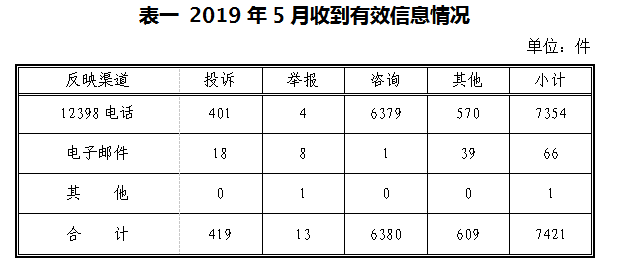 ????一、基本情況 ????2019年5月,國家能源局12398熱線共收到有效信息7421件。按訴求性質分類,投訴419件,占有效信息的5.65%;舉報13件,占有效信息的0.18%;咨詢6380件,占有效信息的85.97%;表揚、求助、建議等其他方面609件,占有效信息的8.21%。 ????按反映渠道分類,12398電話7354件,電子郵件66件,其他1件。(2019年5月收到有效信息情況見表一)