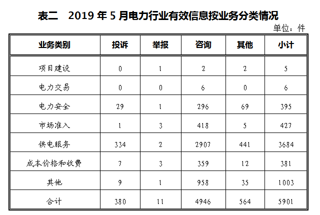 ????二、分類情況 ????按行業分類2019年5月收到的有效信息中: ????電力行業排在首位,有效信息數量為5901件,占全部有效信息的79.52%;其中受理的投訴舉報數量為391件,占全部投訴舉報數量的90.51%。群眾反映的問題主要集中在供電服務、電力安全、成本價格和收費等方面。 ????新能源和可再生能源行業排在第二位,有效信息數量為733件,占全部有效信息的9.88%;其中受理的投訴舉報數量為41件,占全部投訴舉報數量的9.49%。群眾反映的問題主要集中在分布式光伏發電項目上網電費結算、發電量補貼轉付等方面。 ????石油天然氣行業排在第三位,有效信息數量為305件,占全部有效信息的4.11%。有效信息主要集中于咨詢項目備案、燃氣管道改造、燃氣安裝等問題。 ????其他有效信息合計482件,占6.5%,其中涉及煤炭行業的主要以咨詢有關項目審批等問題為主。