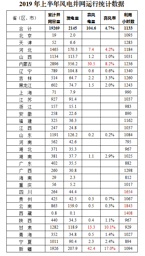 據行業統計,2019年1-6月,全國新增風電裝機容量909萬千瓦,其中海上風電40萬千瓦,累計并網裝機容量達到1.93億千瓦。2019年1-6月,全國風電發電量2145億千瓦時,同比增長11.5%;全國平均風電利用小時數1133小時,同比下降10小時。1-6月,全國棄風電量105億千瓦時,同比減少77億千瓦時;全國平均風電利用率95.3%,平均棄風率4.7%,棄風率同比下降4.0個百分點。全國棄風電量和棄風率持續“雙降”。 2019年1-6月,平均利用小時數較高的省份是云南(1843小時)、四川(1654小時)。 2019年1-6月,棄風仍較為嚴重的地區是新疆(棄風率17.0%、棄風電量42.4億千瓦時)、甘肅(棄風率10.1%、棄風電量13.3億千瓦時)、內蒙古(棄風率8.2%、棄風電量30.5億千瓦時)。