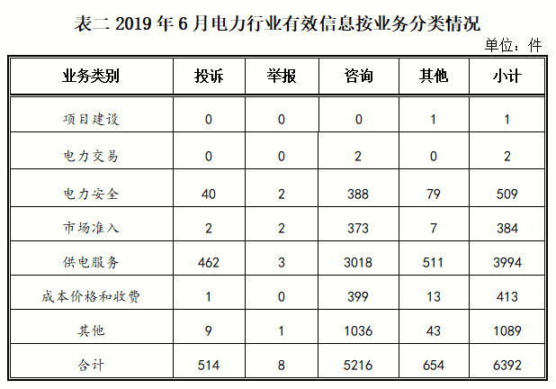 二、分類情況 按行業分類2019年6月收到的有效信息中: 電力行業排在首位,有效信息數量為6392件,占全部有效信息的80.33%;其中受理的投訴舉報數量為522件,占全部投訴舉報數量的93.38%。群眾反映的問題主要集中在供電服務、電力安全、成本價格和收費等方面。(2019年6月電力行業有效信息按業務分類情況見表二) 新能源和可再生能源行業排在第二位,有效信息數量為793件,占全部有效信息的9.97%;其中受理的投訴舉報數量為37件,占全部投訴舉報數量的6.62%。群眾反映的問題主要集中在分布式光伏發電項目并網、上網電費結算、發電量補貼轉付等方面。 石油天然氣行業排在第三位,有效信息數量為260件,占全部有效信息的3.27%。有效信息主要集中于加油站服務、燃氣管道改造、燃氣安裝等問題。 其他有效信息合計512件,占6.43%,其中涉及煤炭行業的主要以咨詢有關項目審批等問題為主。