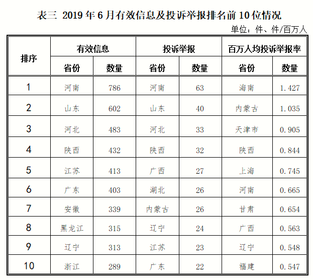三、分布情況 各省(自治區、直轄市)按照收到的有效信息數量排序,河南、山東、河北、陜西、江蘇等列全國前10位;按照投訴舉報數量排序,河南、山東、河北、陜西、廣西等排在全國前10位。按照百萬人均投訴舉報數量排序,海南、內蒙古、天津、陜西、上海等排在全國前10位。(2019年6月有效信息及投訴舉報排名前10位情況見表三)