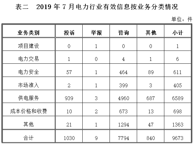 二、分類情況 按行業(yè)分類2019年7月收到的有效信息中: 電力行業(yè)排在首位,有效信息數(shù)量為9673件,占全部有效信息的82.92%;其中受理的投訴舉報數(shù)量為1039件,占全部投訴舉報數(shù)量的96.38%。群眾反映的問題主要集中在供電服務(wù)、電力安全、成本價格和收費等方面。(2019年7月電力行業(yè)有效信息按業(yè)務(wù)分類情況見表二) 新能源和可再生能源行業(yè)排在第二位,有效信息數(shù)量為952件,占全部有效信息的8.16%;其中受理的投訴舉報數(shù)量為39件,占全部投訴舉報數(shù)量的3.61%。群眾反映的問題主要集中在分布式光伏發(fā)電項目并網(wǎng)、上網(wǎng)電費結(jié)算、發(fā)電量補貼轉(zhuǎn)付等方面。 石油天然氣行業(yè)排在第三位,有效信息數(shù)量為322件,占全部有效信息的2.76%。有效信息主要集中于用戶天然氣報裝、咨詢?nèi)細夤艿篱_通和費用、車輛加氣等問題。 其他有效信息合計709件,占6.08%,其中涉及煤炭行業(yè)的主要以咨詢煤礦項目許可、反映煤礦安全等問題為主。