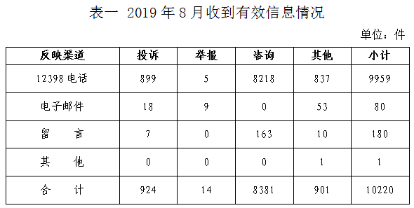 2019年8月12398能源監(jiān)管熱線投訴舉報(bào)處理情況通報(bào)