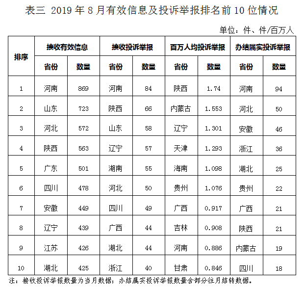 三、分布情況 各省(自治區(qū)、直轄市)按照收到的有效信息數(shù)量排序,河南、山東、河北、陜西、廣東等列全國(guó)前10位;按照投訴舉報(bào)數(shù)量排序,河南、陜西、山東、遼寧、湖南等排在全國(guó)前10位;按照百萬人均投訴舉報(bào)數(shù)量排序,陜西、內(nèi)蒙古、遼寧、天津、海南等排在全國(guó)前10位;按照辦結(jié)屬實(shí)投訴舉報(bào)數(shù)量排序,河南、河北、安徽、浙江、湖北等排在全國(guó)前10位。(2019年8月有效信息及投訴舉報(bào)排名前10位情況見表三)