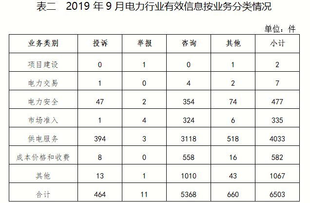 二、分類情況 按行業分類2019年9月收到的有效信息中: 電力行業排在首位,有效信息數量為6503件,占全部有效信息的77.62%;其中受理的投訴舉報數量為475件,占全部投訴舉報數量的94.81%。群眾反映的問題主要集中在供電服務、電力安全、成本價格和收費等方面。(2019年9月電力行業有效信息按業務分類情況見表二) 新能源和可再生能源行業排在第二位,有效信息數量為943件,占全部有效信息的11.26%;其中受理的投訴舉報數量為22件,占全部投訴舉報數量的4.39%。群眾反映的問題主要集中在分布式光伏發電項目并網驗收、補貼費用結算等方面。 石油天然氣行業排在第三位,有效信息數量為423件,占全部有效信息的5.05%。有效信息主要集中于咨詢天然氣報裝收費,反映天然氣設施故障問題等為主。 其他有效信息合計509件,占全部有效信息的6.07%,其中涉及煤炭行業的主要以咨詢煤礦名單和煤礦產量信息等為主。
