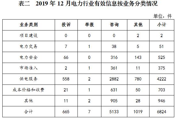 二、分類情況 2019年12月收到的有效信息中: 電力行業排在首位,有效信息數量為6824件,占全部有效信息的81.05%;其中受理的投訴舉報數量為672件,占全部投訴舉報數量的97.39%。群眾反映的問題主要集中在供電服務、電力安全、成本價格和收費等方面。(2019年11月電力行業有效信息按業務分類情況見表二) 新能源和可再生能源行業排在第二位,有效信息數量為670件,占全部有效信息的7.96%;其中受理的投訴舉報數量為18件,占全部投訴舉報數量的2.61%。群眾反映的問題主要集中在分布式光伏發電項目并網驗收、上網電費和補貼結算等方面。 石油天然氣行業排在第三位,有效信息數量為371件,占全部有效信息的4.41%。有效信息主要集中于咨詢居民燃氣安裝及收費、查詢天然氣行業標準、反映燃氣使用故障等方面。 其他有效信息合計554件,占全部有效信息的6.58%。其中涉及煤炭行業的主要內容是咨詢煤炭相關產業政策和文件信息、查詢煤礦項目的審批進度等方面。