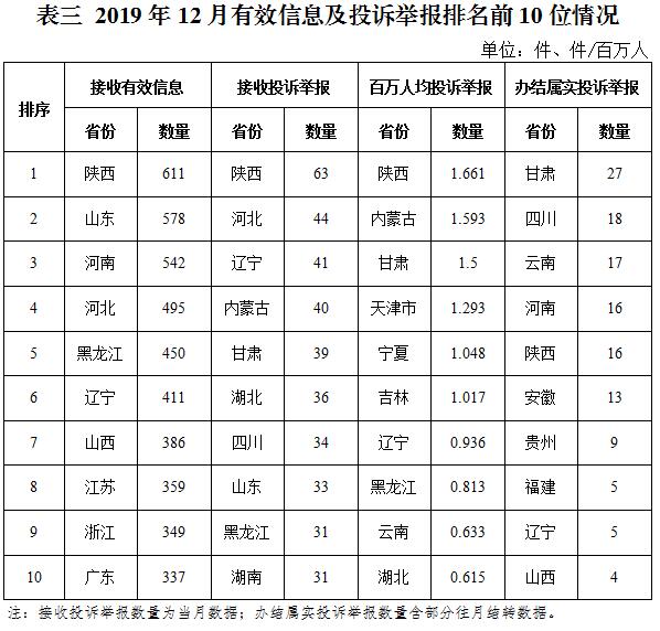 三、分布情況 各省(自治區、直轄市)按照收到的有效信息數量排序,陜西、山東、河南、河北、黑龍江等列全國前10位;按照投訴舉報數量排序,陜西、河北、遼寧、內蒙古、甘肅等排在全國前10位;按照百萬人均投訴舉報數量排序,陜西,內蒙古,甘肅,天津市,寧夏等排在全國前10位;按照辦結屬實投訴舉報數量排序,甘肅、四川、云南、河南、陜西等排在全國前10位。(2019年12月有效信息及投訴舉報排名前10位情況見表三)