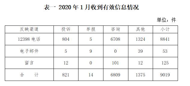 一、基本情況 2020年1月,國家能源局12398熱線共收到有效信息9019件,環比增加7.13%,同比增加2.08%。 按訴求性質分類,投訴821件,占有效信息的9.10%;舉報14件,占有效信息的0.16%;咨詢6809件,占有效信息的75.50%;表揚、求助、建議等其他方面1375件,占有效信息的15.25%。 按反映渠道分類,12398電話8841件,電子郵件53件,留言125件。(2020年1月收到有效信息情況見表一)
