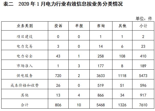二、分類情況 2020年1月收到的有效信息中: 電力行業排在首位,有效信息數量為7610件,占全部有效信息的84.38%;其中受理的投訴舉報數量為816件,占全部投訴舉報數量的97.72%。群眾反映的問題主要集中在供電服務、電力安全、成本價格和收費等方面。(2020年1月電力行業有效信息按業務分類情況見表二) 新能源和可再生能源行業排在第二位,有效信息數量為418件,占全部有效信息的4.63%;其中受理的投訴舉報數量為19件,占全部投訴舉報數量的2.27%。群眾反映的問題主要集中在分布式光伏發電項目并網驗收、上網電費和補貼結算等方面。 石油天然氣行業排在第三位,有效信息數量為372件,占全部有效信息的4.12%。有效信息主要集中于咨詢居民燃氣安裝及收費、反映燃氣故障問題等方面。 其他有效信息合計614件,占全部有效信息的6.81%。其中涉及煤炭行業的主要內容是咨詢煤炭相關產業政策、查詢煤礦項目信息等方面。