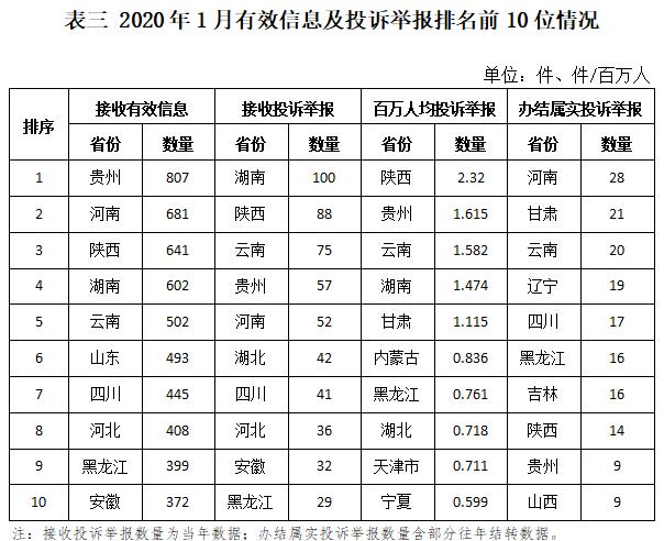 三、分布情況 各省(自治區、直轄市)按照收到的有效信息數量排序,貴州、河南、陜西、湖南、云南等列全國前10位;按照投訴舉報數量排序,湖南、陜西、云南、貴州、河南等排在全國前10位;按照百萬人均投訴舉報數量排序,陜西,貴州,云南,湖南,甘肅等排在全國前10位;按照辦結屬實投訴舉報數量排序,河南、甘肅、云南、遼寧、四川等排在全國前10位。(2020年1月有效信息及投訴舉報排名前10位情況見表三)