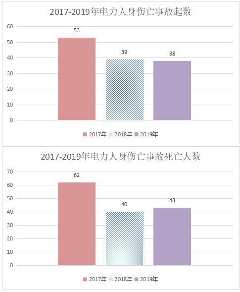 2017-2019年,電力人身傷亡事故起數連續三年下降,事故起數降幅28%;死亡人數總體呈下降趨勢,降幅31%。 (一)按事故業主單位統計 2019年,全國電力安委會企業成員單位發生電力人身傷亡事故31起,占全國電力人身傷亡事故起數的82%,其中,未發生電力人身傷亡事故的單位有中國華電集團有限公司、浙江省能源集團有限公司、廣東省能源集團有限公司;國家開發投資集團有限公司發生1起較大電力人身傷亡事故;發生3起以上電力人身傷亡事故的單位有中國南方電網有限責任公司、國家能源投資集團有限責任公司、內蒙古電力(集團)有限責任公司、華潤電力控股有限公司;死亡人數3人以上的單位有中國南方電網有限責任公司、國家能源投資集團有限責任公司、內蒙古電力(集團)有限責任公司、華潤電力控股有限公司、國家開發投資集團有限公司。 其他單位發生電力人身傷亡事故7起,其中,民勤航天新能源投資有限公司發生1起較大電力人身傷亡事故。