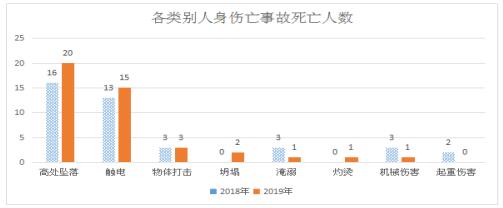 (三)按事故類別統計 2019年,觸電造成15起事故15人死亡,高處墜落造成14起事故20人死亡,物體打擊造成3起事故3人死亡,坍塌造成2起事故2人死亡,機械傷害造成2起事故1人死亡,淹溺、灼燙各造成1起事故1人死亡。其中,觸電和高處墜落類別事故多發,分別占事故總起數39%和37%,死亡人數分別占死亡總人數35%和47%。