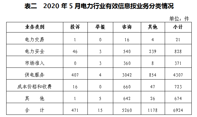 二、分類情況 2020年5月收到的有效信息中: 電力行業排在首位,有效信息數量為6924件,占全部有效信息的83.24%;其中受理的投訴舉報數量418件,占全部投訴舉報數量的82.94%。群眾反映問題主要集中在供電服務、電力安全、成本價格和收費等方面。(2020年5月電力行業有效信息按業務分類情況見表二) 新能源和可再生能源行業排在第二位,有效信息數量為470件,占全部有效信息的5.65%;其中受理的投訴舉報數量為11件,占全部投訴舉報數量的2.18%。群眾反映的問題主要集中在分布式光伏發電項目并網驗收、上網電費和補貼結算等方面。 石油天然氣行業排在第三位,有效信息數量為179件,占全部有效信息的2.15%。有效信息主要集中于咨詢居民燃氣安裝及收費、反映燃氣故障問題等方面。 其他有效信息合計745件,占全部有效信息的8.96%。其中涉及煤炭行業的主要內容是咨詢煤炭相關產業政策、查詢煤礦項目信息等方面。