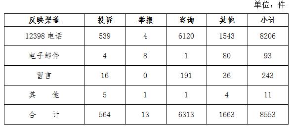 一、基本情況 2020年6月,國家能源局12398熱線共收到有效信息8553件,環(huán)比增加2.83%,同比增加7.50%。 按訴求性質(zhì)分類,投訴564件,占有效信息的6.59%;舉報13件,占有效信息的0.15%;咨詢6313件,占有效信息的73.81%;表揚、求助、建議等其他方面1663件,占有效信息的19.44%。 按反映渠道分類,12398電話8206件,電子郵件93件,留言243件,其他11件。(2020年6月收到有效信息情況見表一) 表一 2020年6月收到有效信息情況