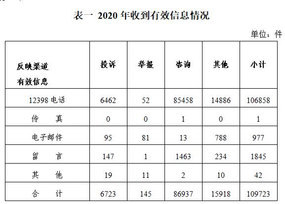 一、基本情況 2020年,國(guó)家能源局12398能源監(jiān)管熱線(以下簡(jiǎn)稱12398熱線)共收到有效信息109723件(包含投訴、舉報(bào)、咨詢和其他訴求類別),同比增加9.06%。(2020年收到有效信息情況見表一)