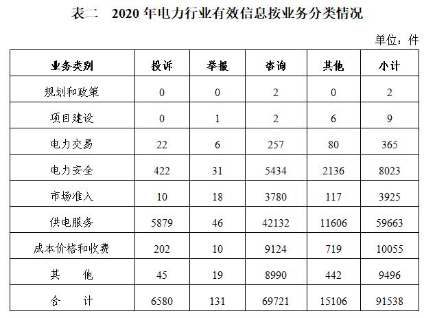 按訴求性質(zhì)分類,投訴6723件,占有效信息的6.13%;舉報(bào)145件,占有效信息的0.13%;咨詢86937件,占有效信息的79.23%;表揚(yáng)、求助、建議等其他方面15918件,占有效信息的14.51%。 按反映渠道分類,12398電話106858件,傳真1件,電子郵件977件,留言1845件,其他42件。 二、分類情況 2020年收到的有效信息中: 電力行業(yè)排在首位,有效信息數(shù)量為91538件,占全部有效信息的83.43%。群眾關(guān)注的內(nèi)容主要集中于故障停電、停電信息、電費(fèi)收取等方面。(2020年電力行業(yè)有效信息按業(yè)務(wù)分類情況見表二)