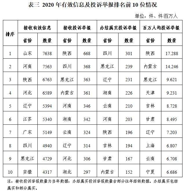 新能源和可再生能源行業(yè)排在第二位,有效信息數(shù)量為5591件,占全部有效信息的5.10%。群眾關(guān)注的內(nèi)容主要集中于光伏發(fā)電相關(guān)政策、分布式光伏發(fā)電項(xiàng)目補(bǔ)貼結(jié)算等方面。 石油天然氣行業(yè)排在第三位,有效信息數(shù)量為4827件,占全部有效信息的4.40%。群眾關(guān)注的內(nèi)容主要集中于咨詢居民燃?xì)馔狻⑷細(xì)獍惭b及收費(fèi)、反映燃?xì)夤收蠁栴}等方面。 其他有效信息合計(jì)7767件,占全部有效信息的7.08%。其中,涉及煤炭行業(yè)的主要內(nèi)容是咨詢煤炭相關(guān)產(chǎn)業(yè)政策、煤炭安全等方面。 三、分布情況 各省(自治區(qū)、直轄市)按照收到的有效信息數(shù)量排序,山東、河南、陜西、河北、遼寧、江蘇、廣東、四川、黑龍江、安徽等列全國(guó)前10位;按照投訴舉報(bào)數(shù)量排序,陜西、四川、黑龍江、內(nèi)蒙古、河南、湖南、云南、遼寧、河北、湖北等排在全國(guó)前10位;按照辦結(jié)屬實(shí)投訴舉報(bào)數(shù)量排序,四川、黑龍江、遼寧、湖南、云南、河南、陜西、吉林、甘肅、內(nèi)蒙古等排在全國(guó)前10位;按照百萬人均投訴舉報(bào)數(shù)量排序,陜西、內(nèi)蒙古、黑龍江、天津、吉林、甘肅、遼寧、上海、云南、寧夏等排在全國(guó)前10位。(2020年有效信息及投訴舉報(bào)排名前10位情況見表三)