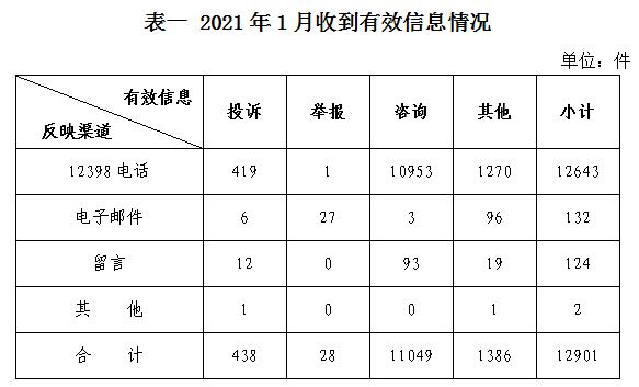 一、基本情況 2021年1月,國家能源局12398能源監管熱線(以下簡稱12398熱線)共收到有效信息12901件(包含投訴、舉報、咨詢和其他訴求類別),環比增加16.01%,同比增加43.04%。(2021年1月收到有效信息情況見表一)