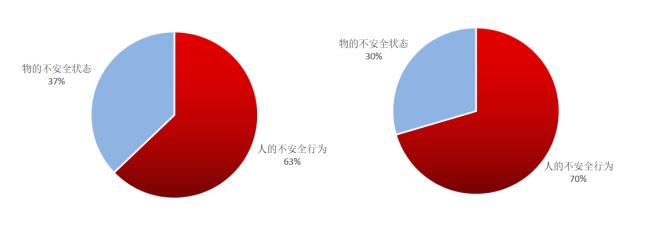 圖1:各類別人身傷亡事故起數(shù)占比(左)和各類別人身傷亡事故人數(shù)占比(右) (二)按事故原因統(tǒng)計 2020年,人的不安全行為造成22起事故31人死亡,物的不安全狀態(tài)造成13起事故13人死亡。