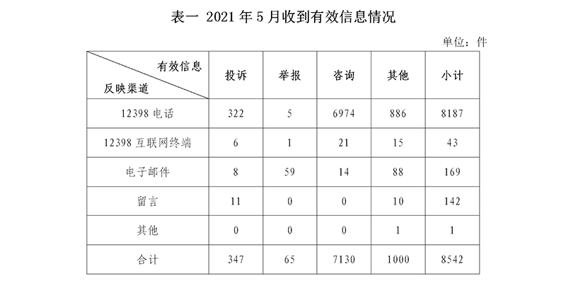 一、基本情況 2021年5月,國(guó)家能源局12398能源監(jiān)管熱線(以下簡(jiǎn)稱12398熱線)共收到有效信息8542件(包含投訴、舉報(bào)、咨詢和其他訴求類別),環(huán)比減少1.78%,同比增加2.69%。(2021年5月收到有效信息情況見(jiàn)表一)
