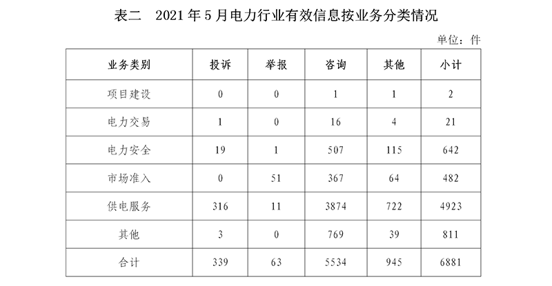 按訴求性質(zhì)分類,投訴347件,占有效信息的4.06%;舉報(bào)65件,占有效信息的0.76%;咨詢7130件,占有效信息的83.47%;表?yè)P(yáng)、求助、建議等其他方面1000件,占有效信息的11.71%。 按反映渠道分類,12398電話8187件,12398互聯(lián)網(wǎng)終端43件,電子郵件169件,留言142件,其他1件。 二、分類情況 2021年5月收到的有效信息中: 電力行業(yè)排在首位,有效信息數(shù)量為6881件,占全部有效信息的80.55%,群眾關(guān)注的內(nèi)容主要集中于故障停電、電費(fèi)交納、電表計(jì)量等方面。(2021年5月電力行業(yè)有效信息按業(yè)務(wù)分類情況見(jiàn)表二)