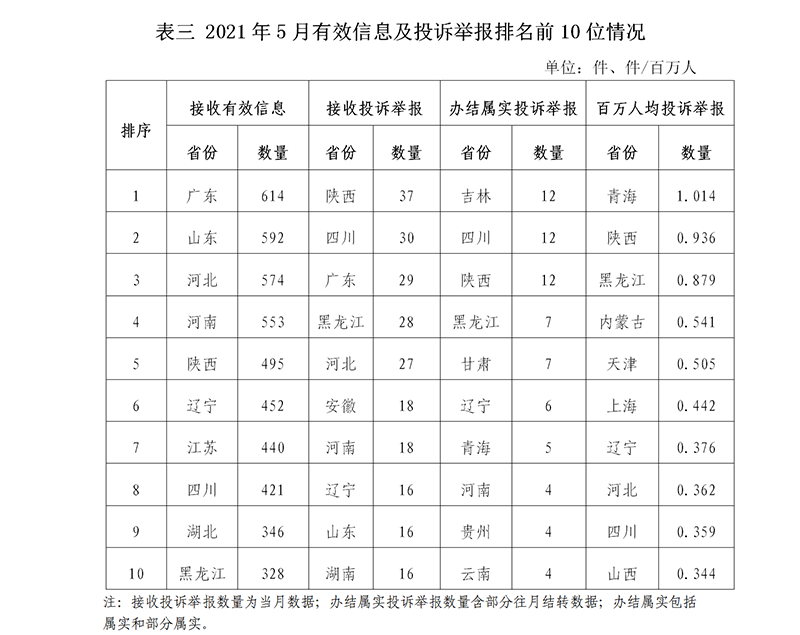 石油天然氣行業(yè)排在第二位,有效信息數(shù)量為518件,占全部有效信息的6.06%。群眾關(guān)注的內(nèi)容主要集中于居民燃?xì)庠O(shè)備故障、居民燃?xì)鈭?bào)裝等方面。 新能源和可再生能源行業(yè)排在第三位,有效信息數(shù)量為505件,占全部有效信息的5.91%。群眾關(guān)注的內(nèi)容主要集中于居民分布式光伏發(fā)電項(xiàng)目并網(wǎng)、電費(fèi)結(jié)算等方面。 其他有效信息合計(jì)638件,占全部有效信息的7.47%。其中群眾對(duì)于煤炭行業(yè)關(guān)注的內(nèi)容主要集中于煤炭行業(yè)政策咨詢等方面。 三、分布情況 各省(自治區(qū)、直轄市)按照收到的有效信息數(shù)量排序,廣東、山東、河北、河南、陜西、遼寧、江蘇、四川、湖北、黑龍江等列全國(guó)前10位;按照投訴舉報(bào)數(shù)量排序,陜西、四川、廣東、黑龍江、河北、安徽、河南、遼寧、山東、湖南等排在全國(guó)前10位;按照辦結(jié)屬實(shí)投訴舉報(bào)數(shù)量排序,吉林、四川、陜西、黑龍江、甘肅、遼寧、青海、河南、貴州、云南等排在全國(guó)前10位;按照百萬(wàn)人均投訴舉報(bào)數(shù)量排序,青海、陜西、黑龍江、內(nèi)蒙古、天津、上海、遼寧、河北、四川、山西等排在全國(guó)前10位。(2021年5月有效信息及投訴舉報(bào)排名前10位情況見(jiàn)表三)